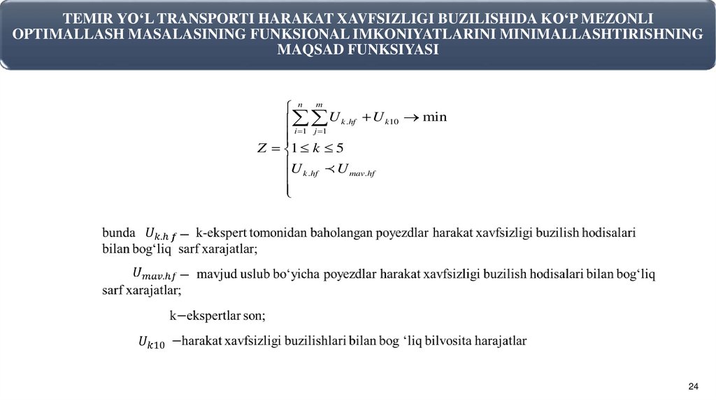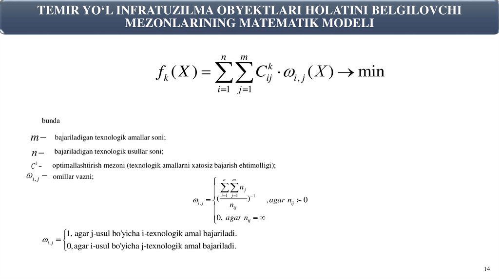 • temir yo‘l infratuzilma obyektlari holatini belgilovchi mezonlarning matematik modeli hamda
