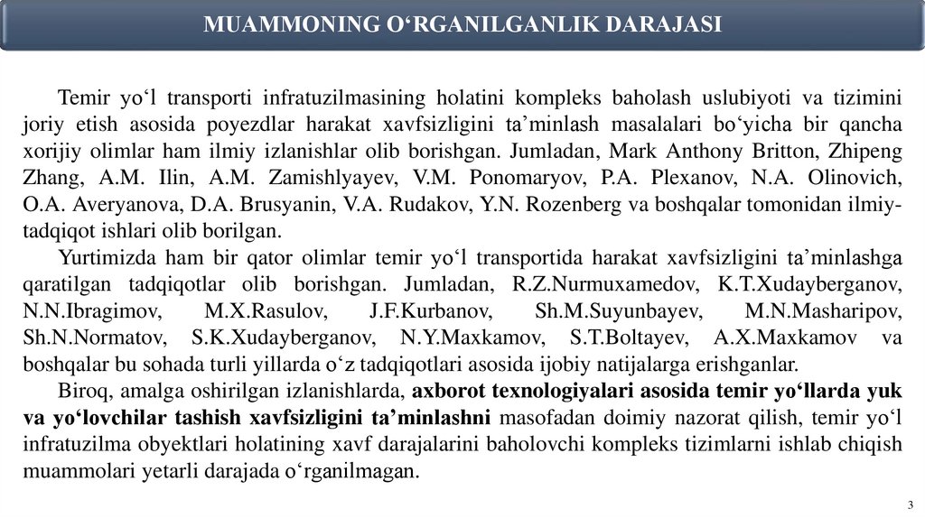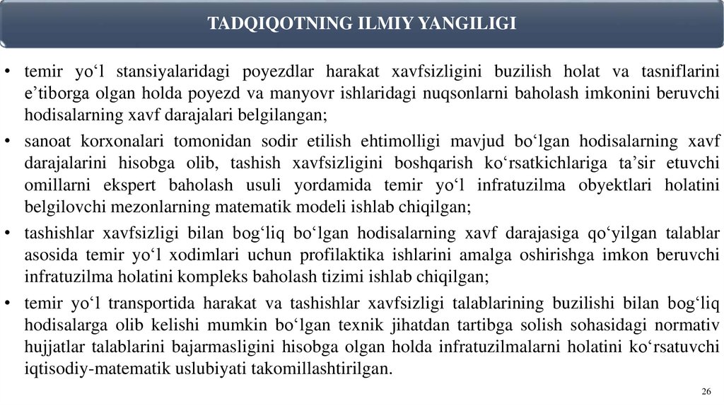 TADQIQOTNING ILMIY YANGILIGI• temir yо‘l stansiyalaridagi poyezdlar harakat xavfsizligini buzilish holat va tasniflarini