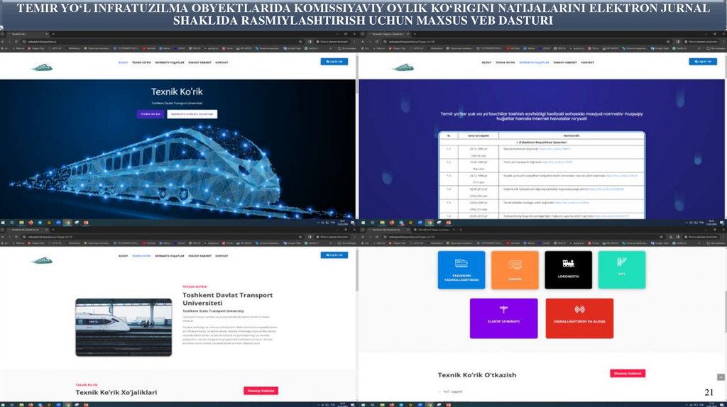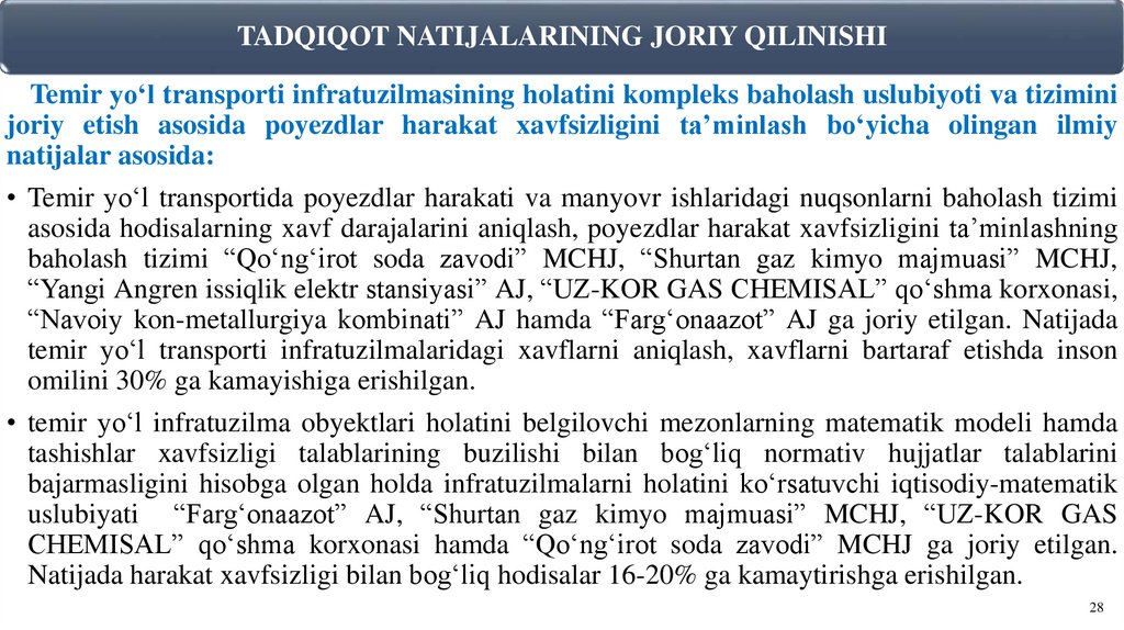 TADQIQOT NATIJALARINING JORIY QILINISHITemir yo‘l transporti infratuzilmasining holatini kompleks baholash uslubiyoti va tizimini