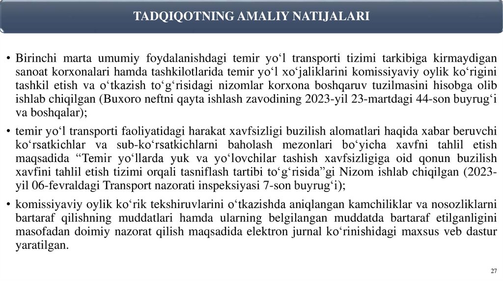 TADQIQOTNING AMALIY NATIJALARI• Birinchi marta umumiy foydalanishdagi temir yo‘l transporti tizimi tarkibiga kirmaydigan