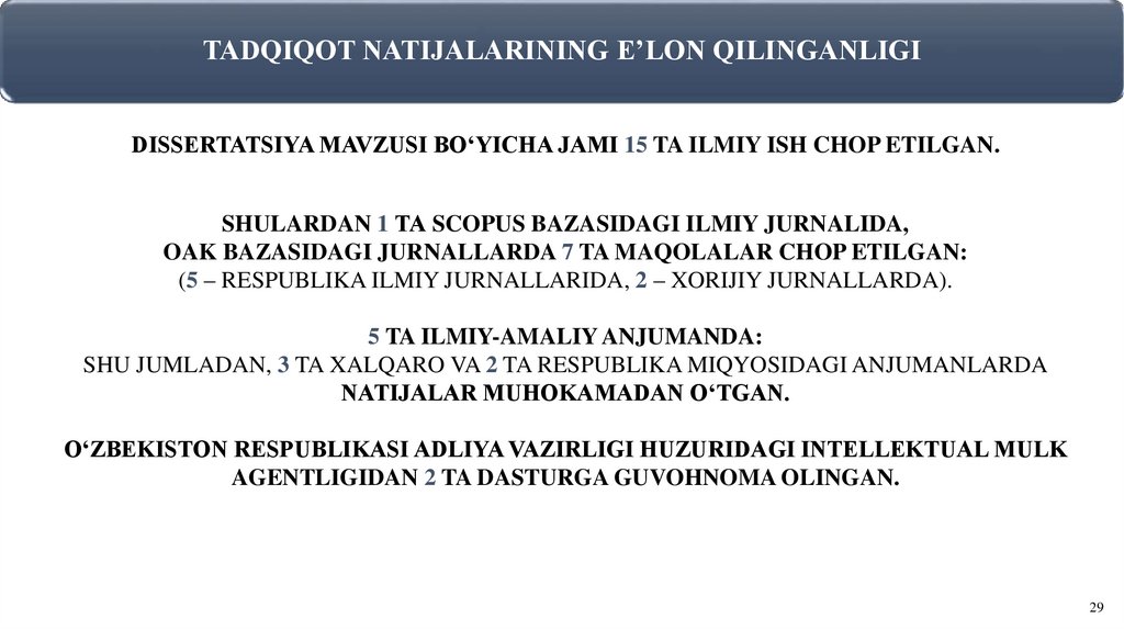 TADQIQOT NATIJALARINING E’LON QILINGANLIGIDISSERTATSIYA MAVZUSI BO‘YICHA JAMI 15 TA ILMIY ISH CHOP ETILGAN.
