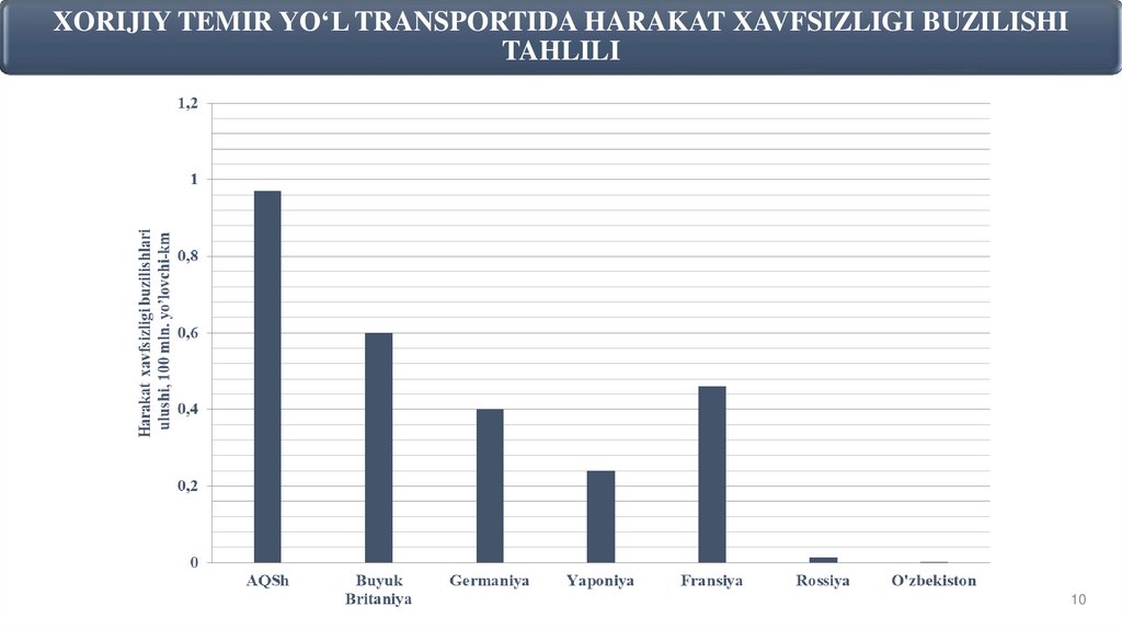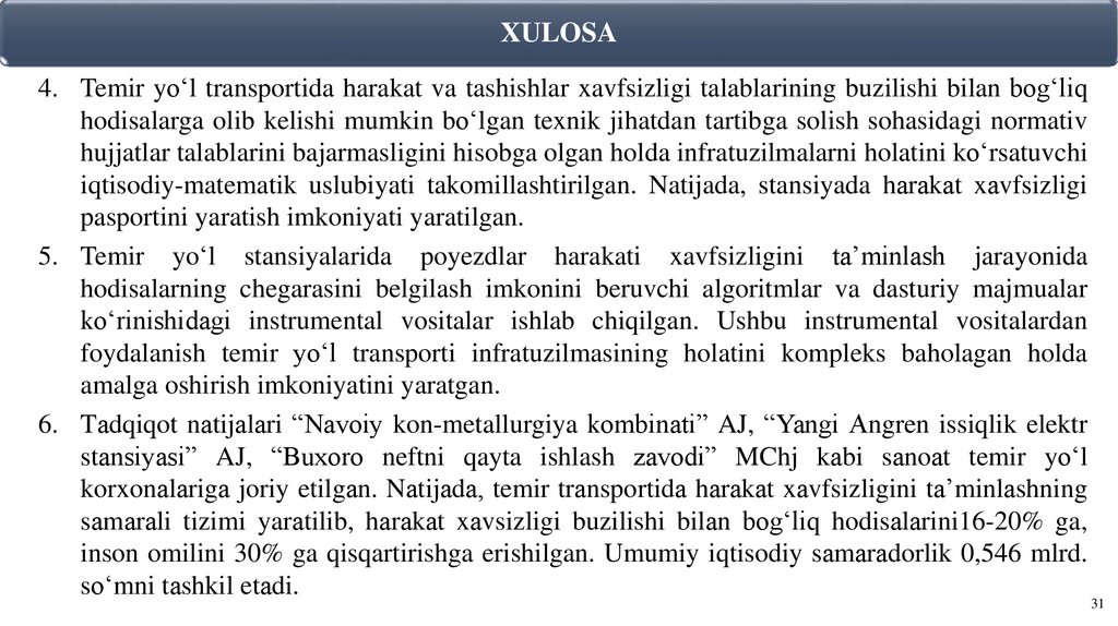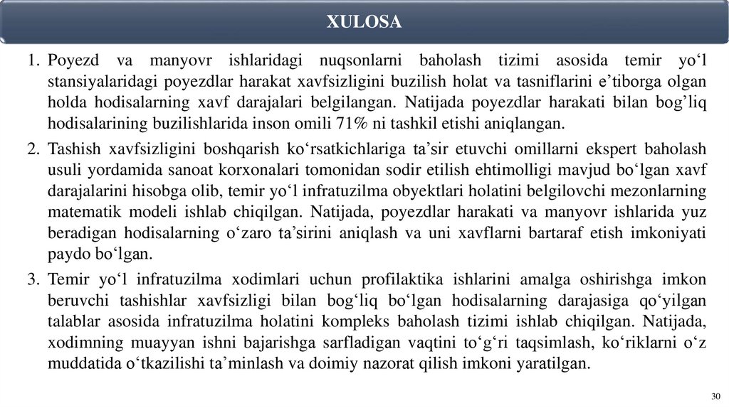 XULOSA4. Temir yо‘l transportida harakat va tashishlar xavfsizligi talablarining buzilishi bilan bog‘liq