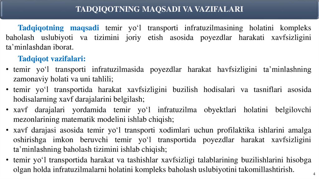 TADQIQOTNING MAQSADI VA VAZIFALARITadqiqotning maqsadi temir yo‘l transporti infratuzilmasining holatini kompleks