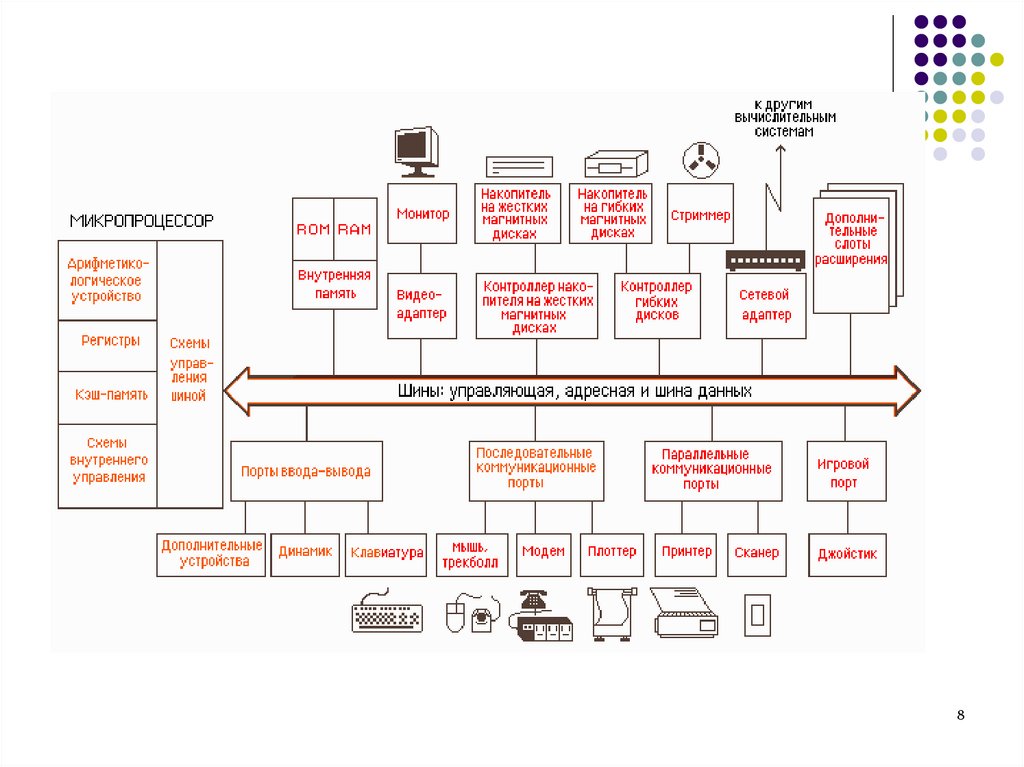 ЗУ, мыши, принтера и т.д. обеспечивается через контроллеры, адаптеры,