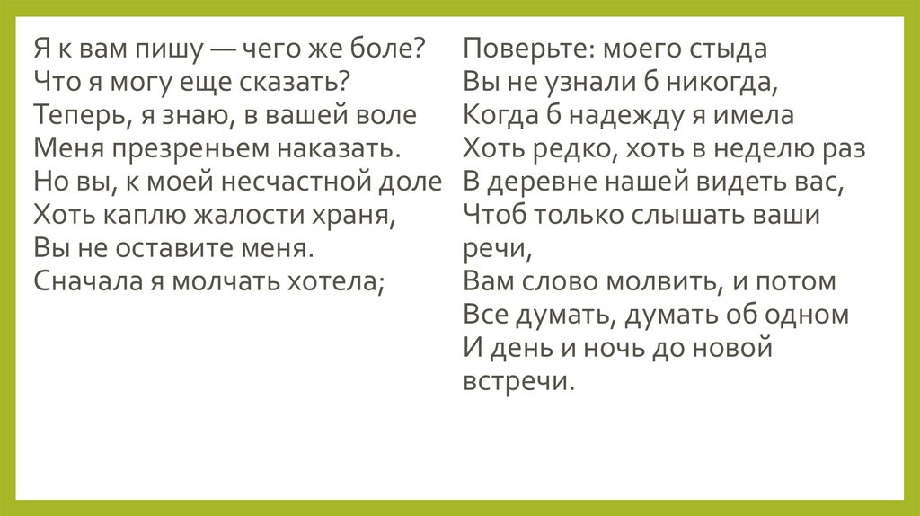 Я к вам пишу — чего же боле? Поверьте: моего стыдаЧто я могу еще сказать?