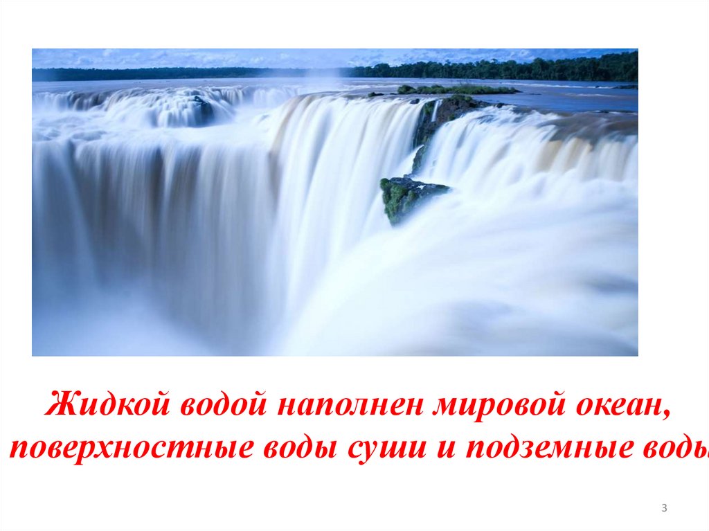 Жидкой водой наполнен мировой океан,поверхностные воды суши и подземные воды