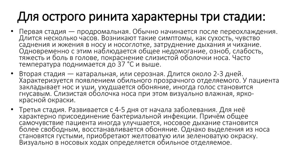 Для острого ринита характерны три стадии:• Первая стадия — продромальная. Обычно начинается после переохлаждения.