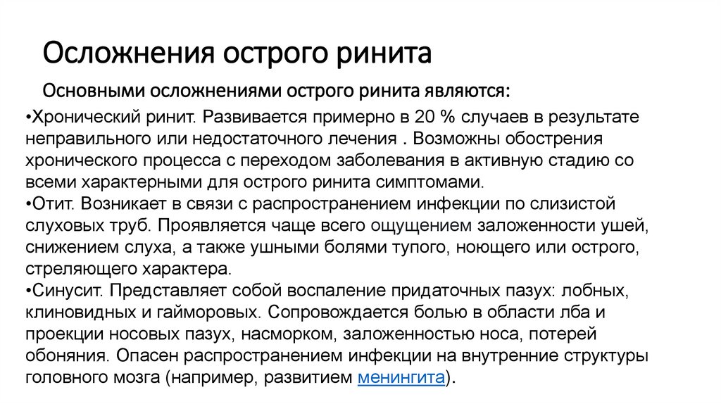 Осложнения острого ринитаОсновными осложнениями острого ринита являются:
