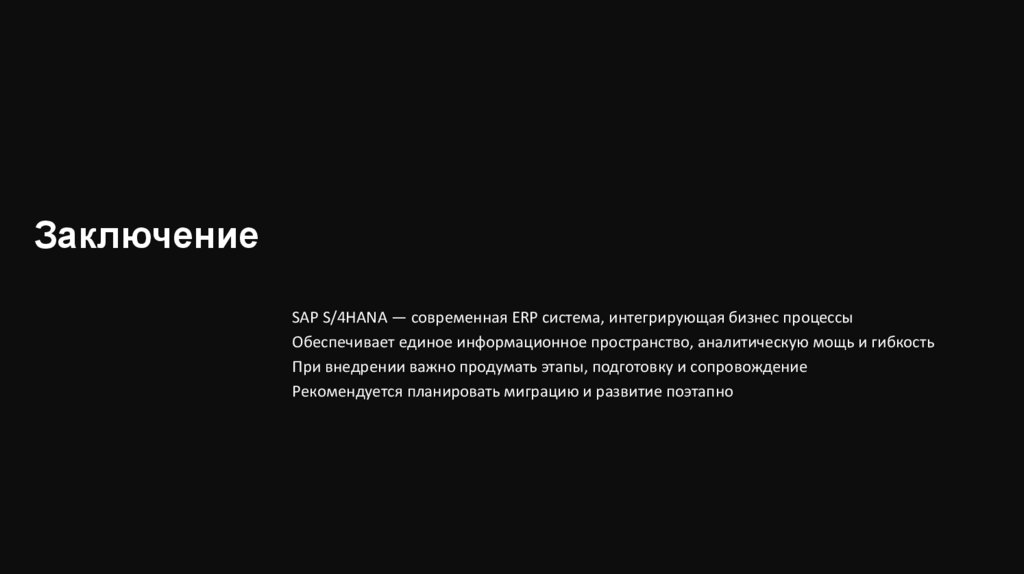 ЗаключениеSAP S/4HANA — современная ERP система, интегрирующая бизнес процессы