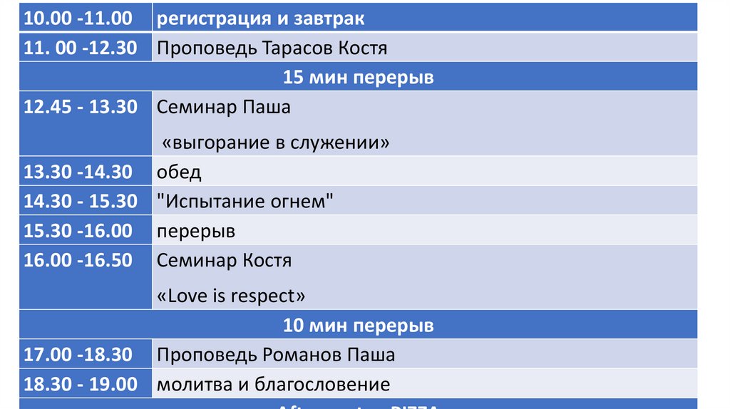 10.00 -11.00 регистрация и завтрак11. 00 -12.30 Проповедь Тарасов Костя