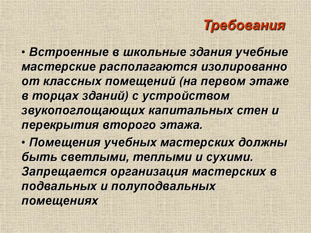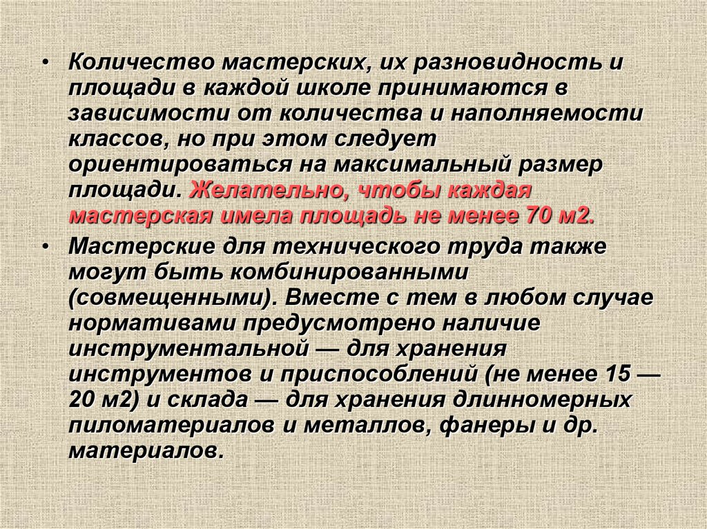 • Количество мастерских, их разновидность иплощади в каждой школе принимаются в