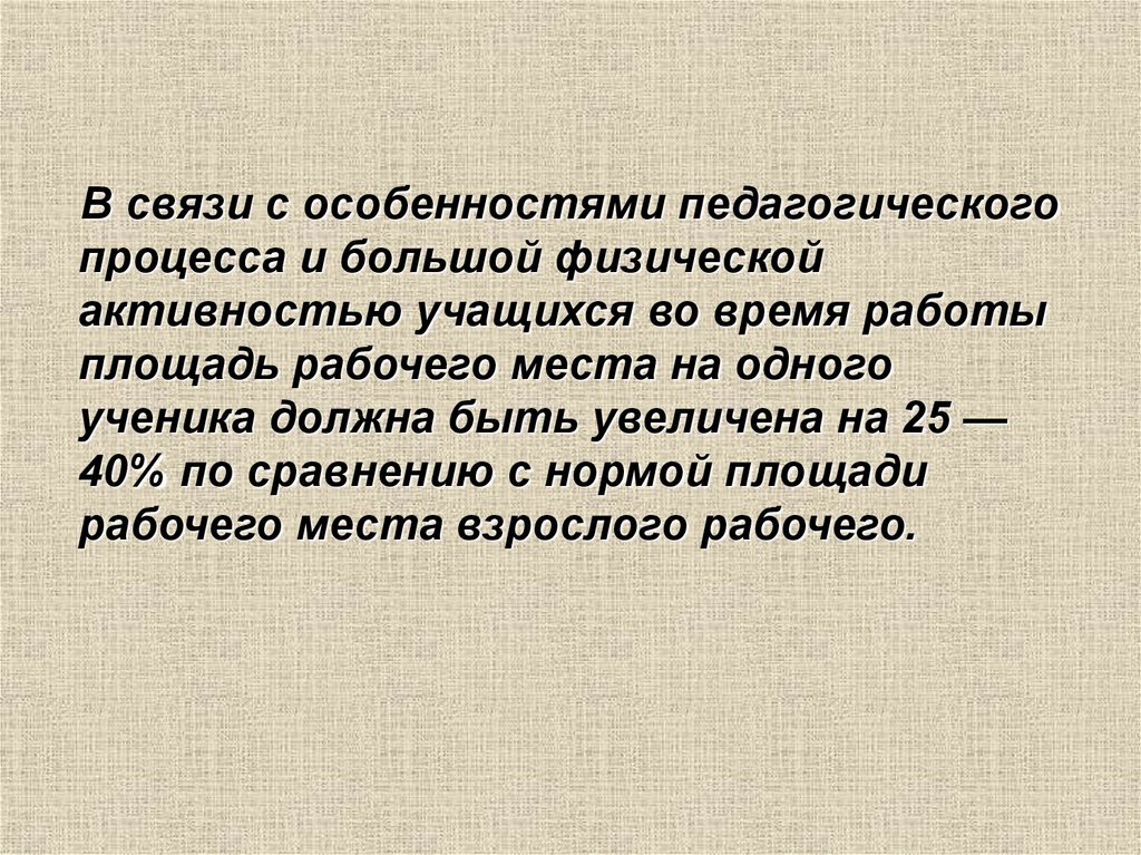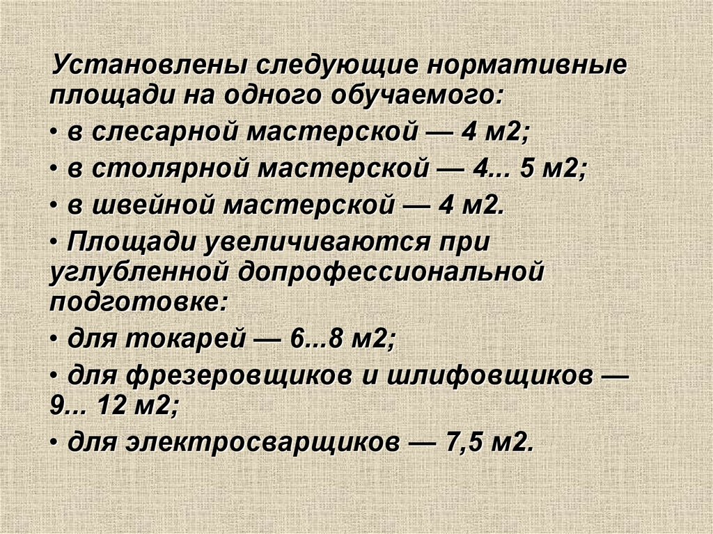 Установлены следующие нормативныеплощади на одного обучаемого: