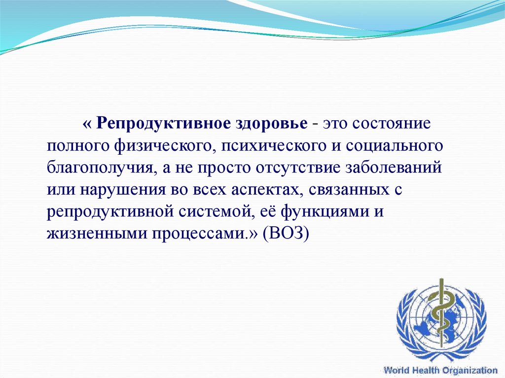 « Репродуктивное здоровье - это состояниеполного физического, психического и социального