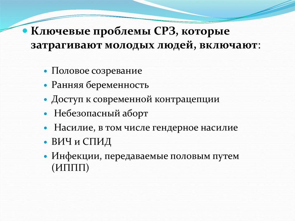 Ключевые проблемы СРЗ, которыезатрагивают молодых людей, включают: