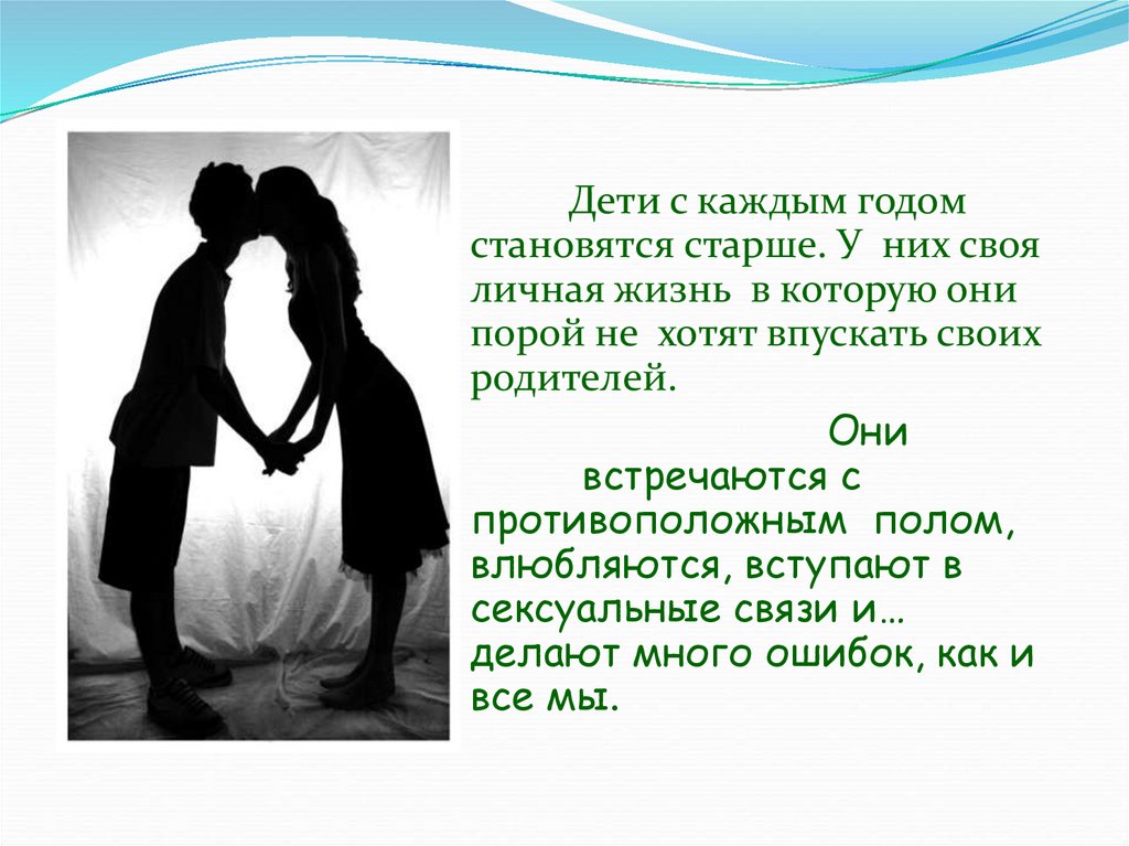 Ситуация в семье: для подростков, находящихся в хороших отношениях сосвоими родителями, характерно более позднее начало половой жизни.