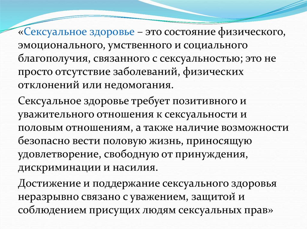 «Сексуальное здоровье – это состояние физического,эмоционального, умственного и социального
