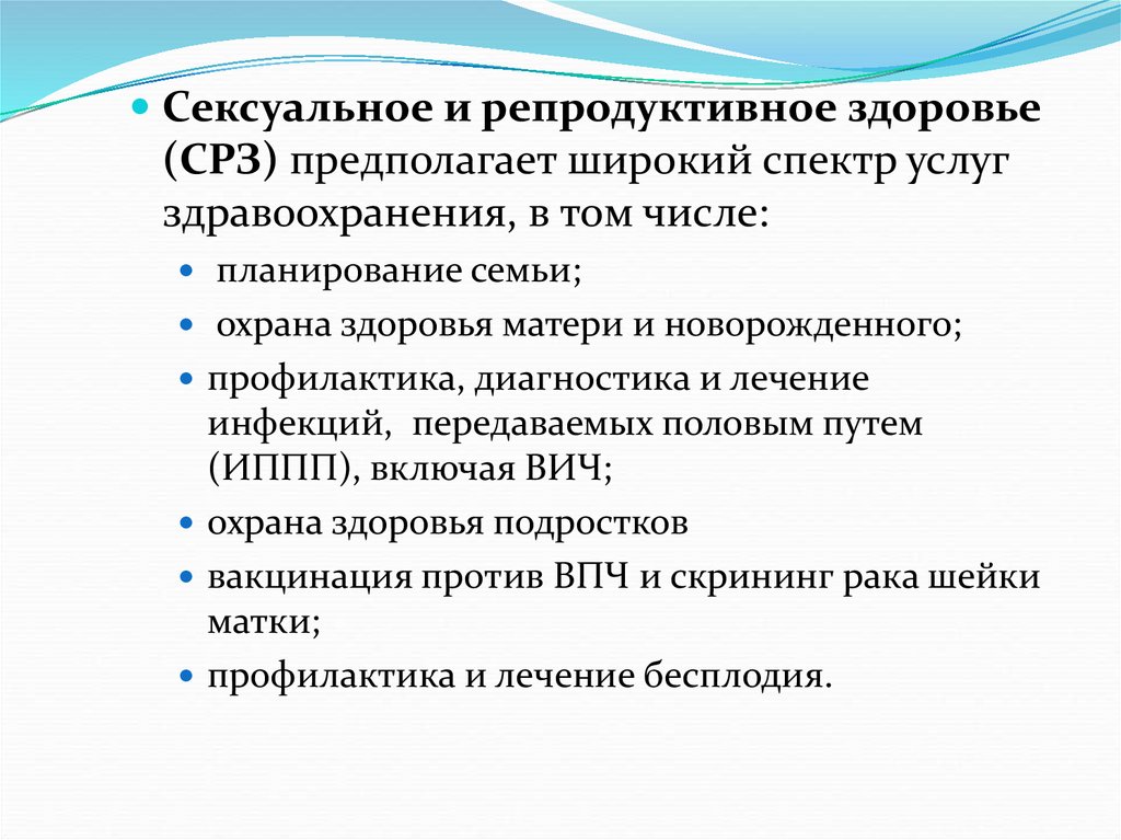 Сексуальное и репродуктивное здоровье(СРЗ) предполагает широкий спектр услуг