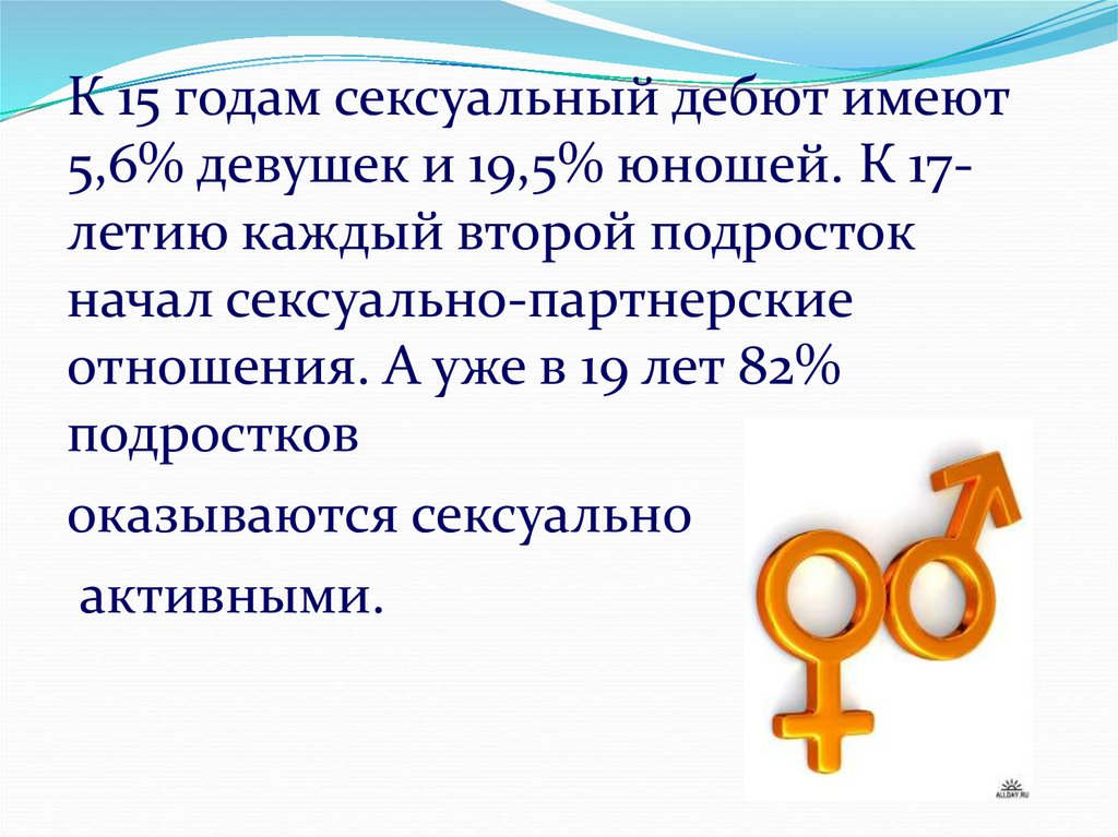 К 15 годам сексуальный дебют имеют5,6% девушек и 19,5% юношей. К 17летию каждый второй подросток