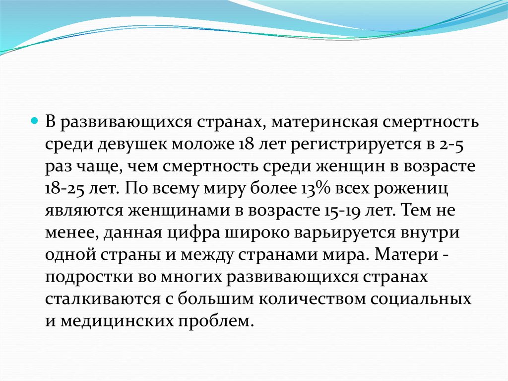 В развивающихся странах, материнская смертностьсреди девушек моложе 18 лет регистрируется в 2-5
