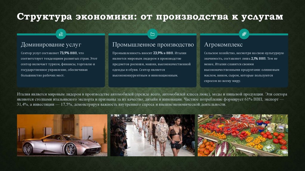 являются столпами итальянского экспорта и признаны за их качество, дизайн и инновации. Частное потребление формирует 61% ВВП, экспорт —