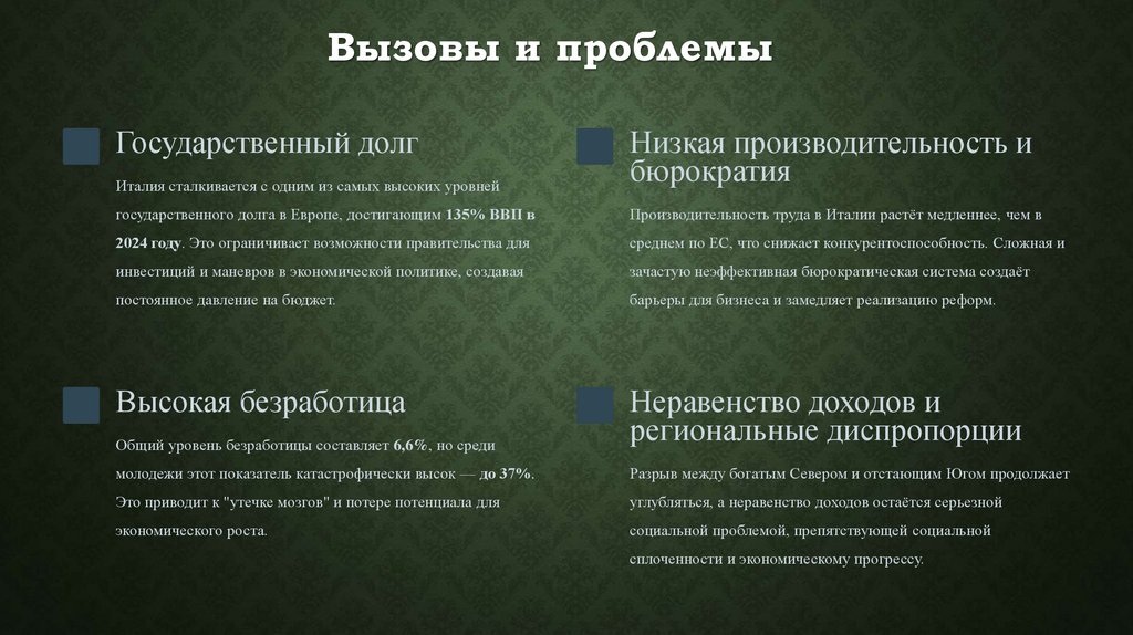 Итальянская экономика, несмотря на свой значительный размер, сталкивается с проблемами низкой производительности, высокого
