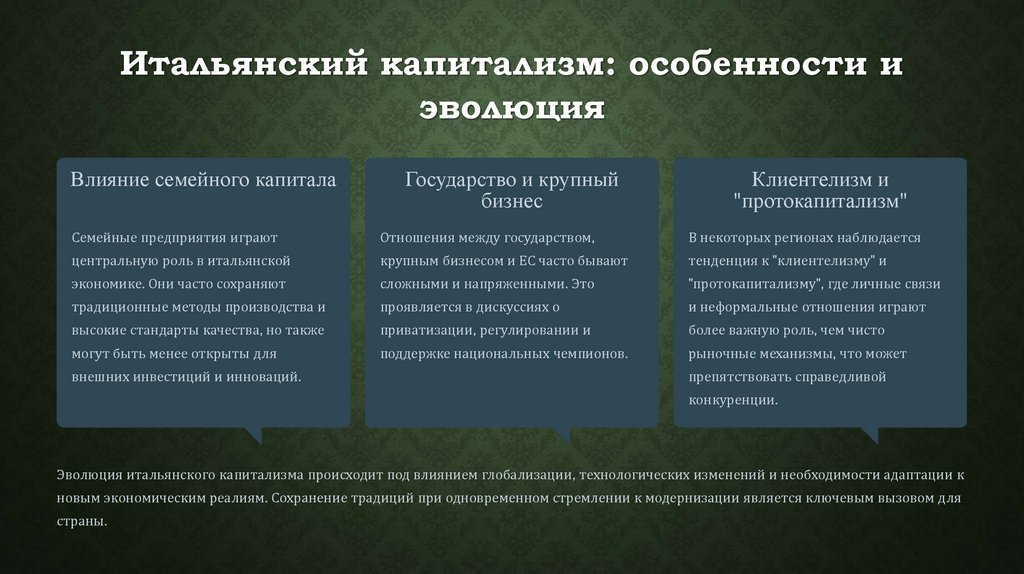 Эволюция итальянского капитализма происходит под влиянием глобализации, технологических изменений и необходимости адаптации к