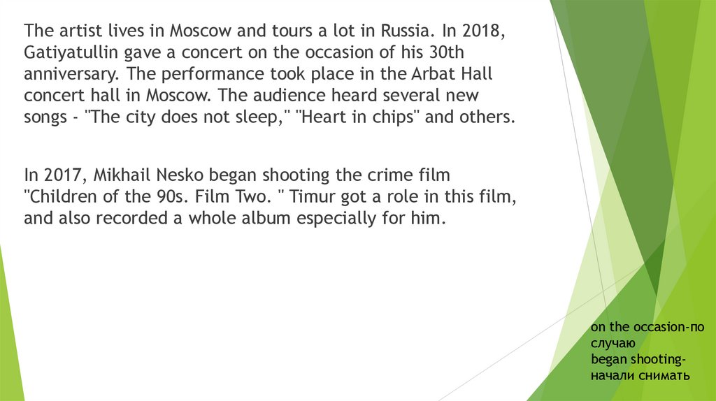 The artist lives in Moscow and tours a lot in Russia. In 2018,Gatiyatullin gave a concert on the occasion of his 30th