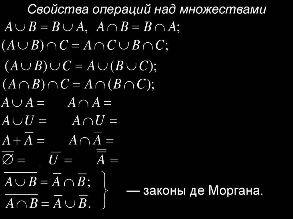 Свойства операций над множествамиA B B A, A B B A;