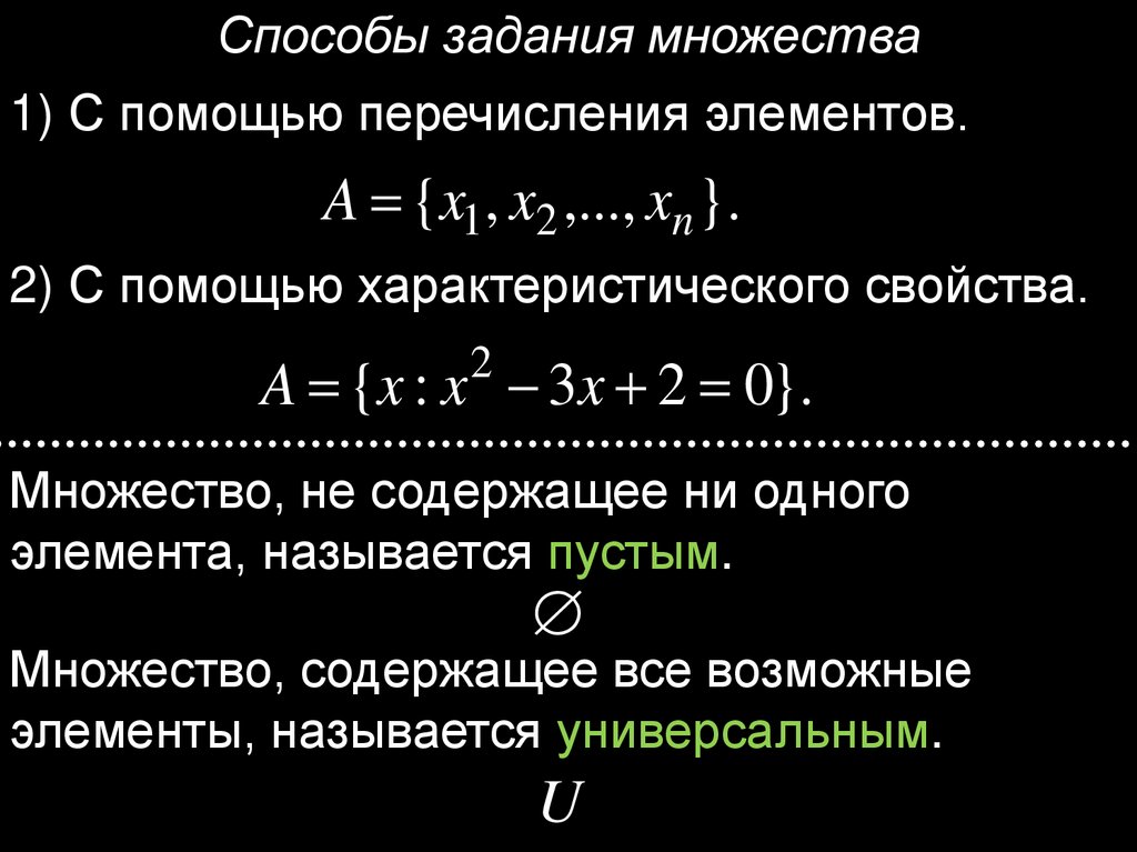 Способы задания множества1) С помощью перечисления элементов.