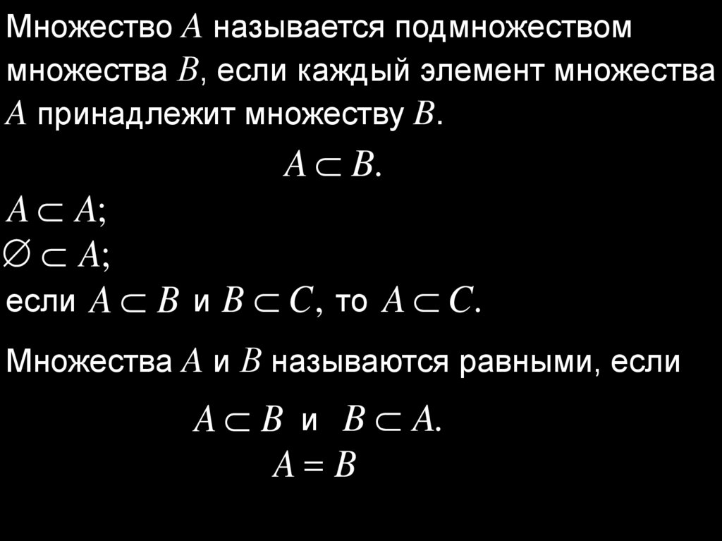 Множество A называется подмножествоммножества В, если каждый элемент множества