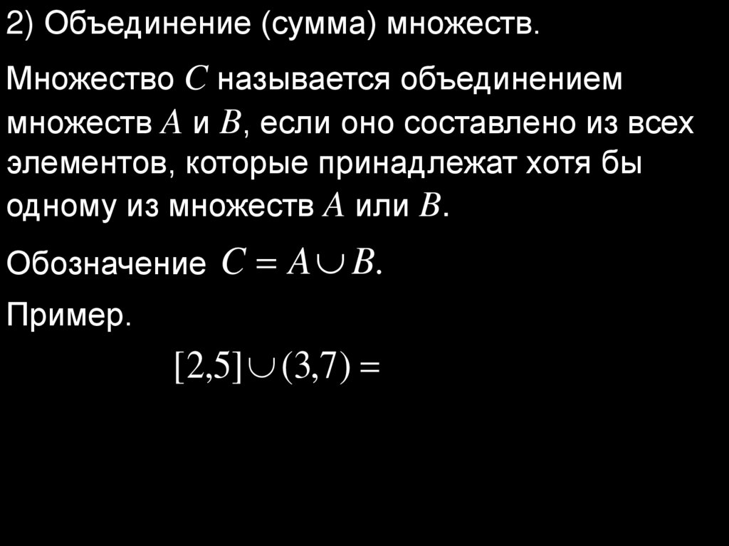 2) Объединение (сумма) множеств.Множество C называется объединением