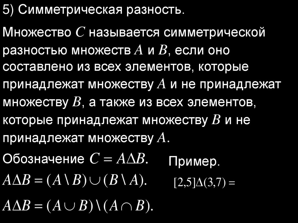 5) Симметрическая разность.Множество C называется симметрической