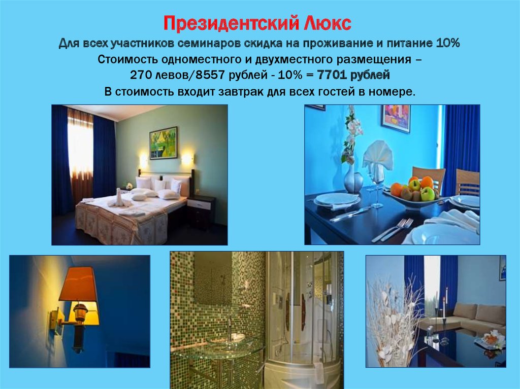 Президентский ЛюксДля всех участников семинаров скидка на проживание и питание 10%