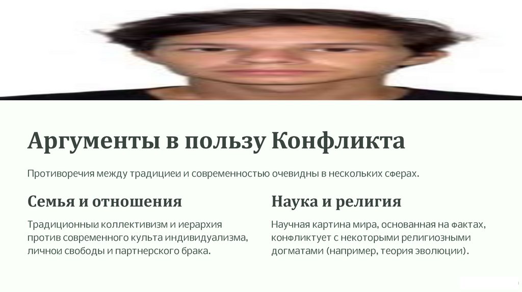 Аргументы в пользу КонфликтаПротиворечия между традицией и современностью очевидны в нескольких сферах.