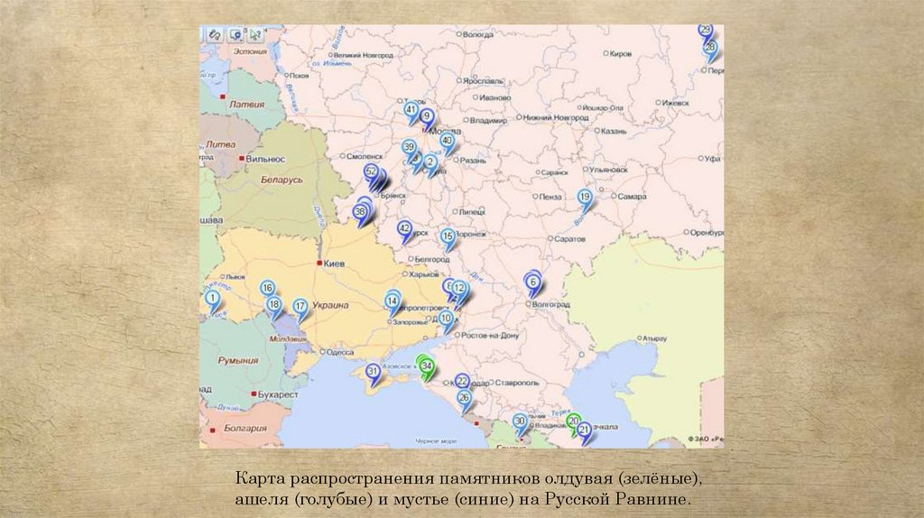 Карта распространения памятников олдувая (зелёные),ашеля (голубые) и мустье (синие) на Русской Равнине.