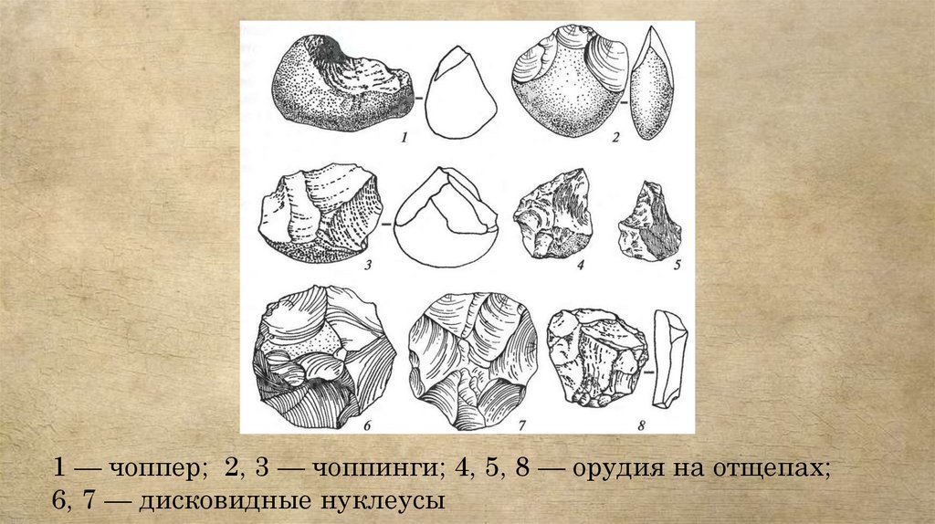 1 — чоппер; 2, 3 — чоппинги; 4, 5, 8 — орудия на отщепах;6, 7 — дисковидные нуклеусы