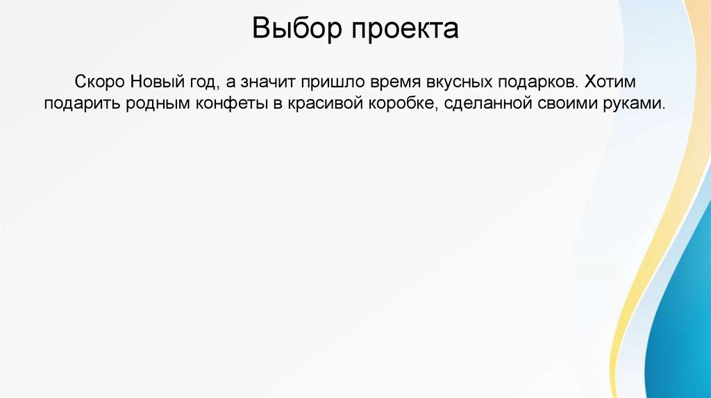 Выбор проектаСкоро Новый год, а значит пришло время вкусных подарков. Хотим