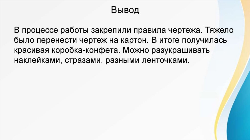 ВыводВ процессе работы закрепили правила чертежа. Тяжело