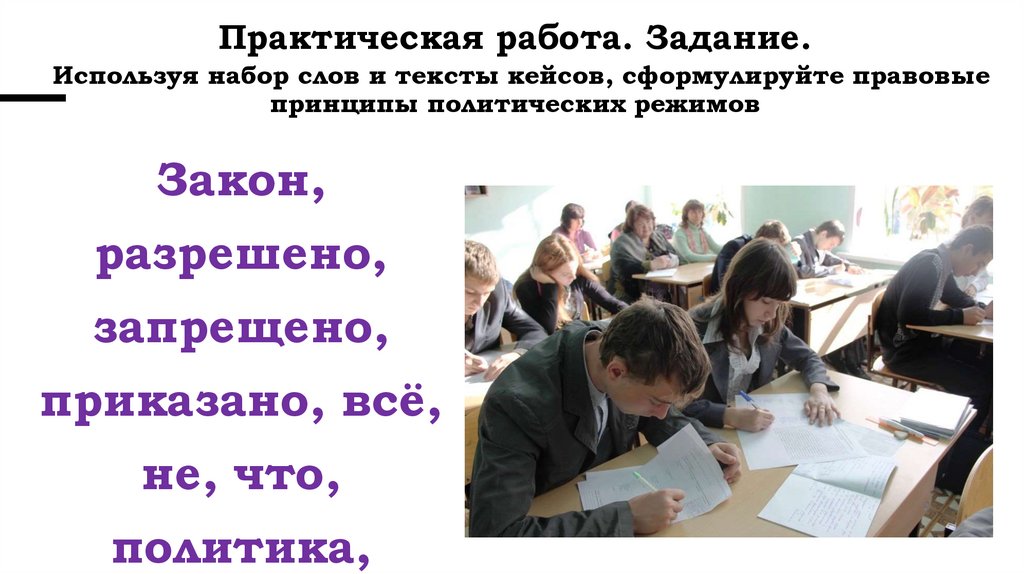 31. Практическая работа. Задание. Используя набор слов и тексты кейсов, сформулируйте правовые принципы политических режимов