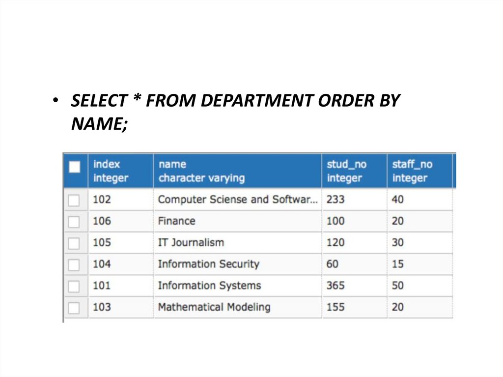 • SELECT * FROM DEPARTMENT ORDER BYNAME;