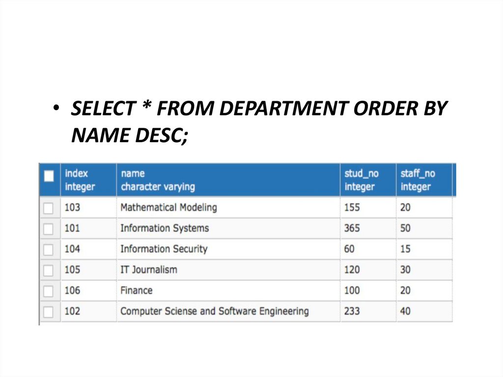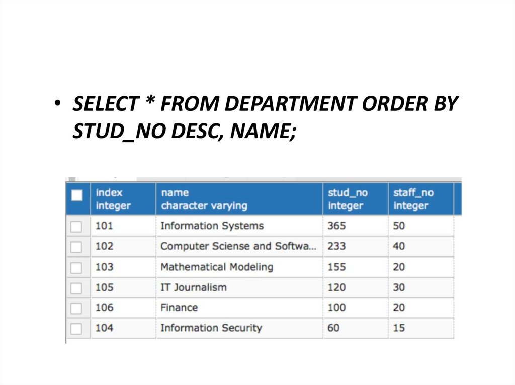 • SELECT * FROM DEPARTMENT ORDER BYSTUD_NO DESC, NAME;