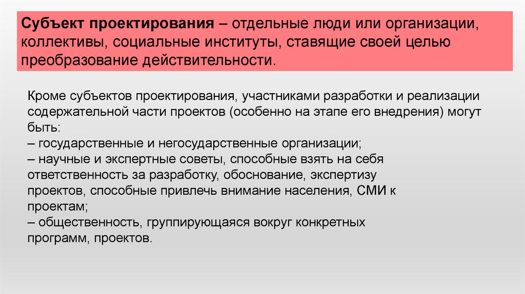 Субъект проектирования – отдельные люди или организации,коллективы, социальные институты, ставящие своей целью