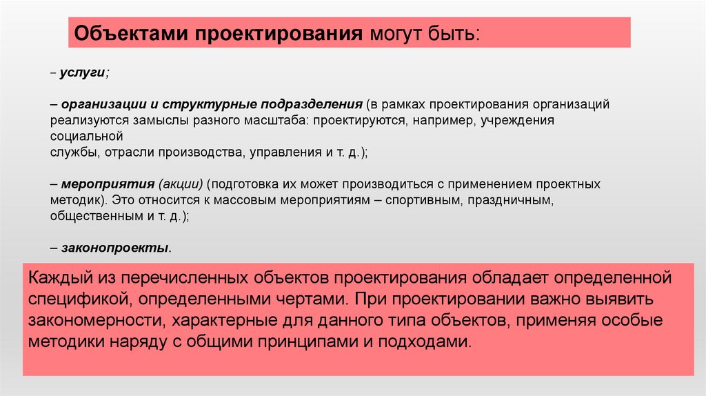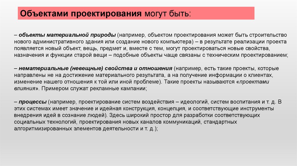 Объектами проектирования могут быть:– объекты материальной природы (например, объектом проектирования может быть строительство