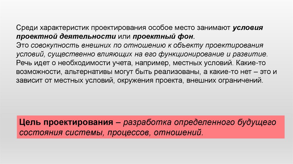 Среди характеристик проектирования особое место занимают условияпроектной деятельности или проектный фон.