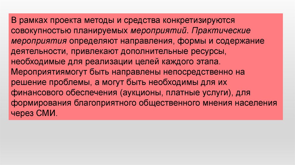 В рамках проекта методы и средства конкретизируютсясовокупностью планируемых мероприятий. Практические