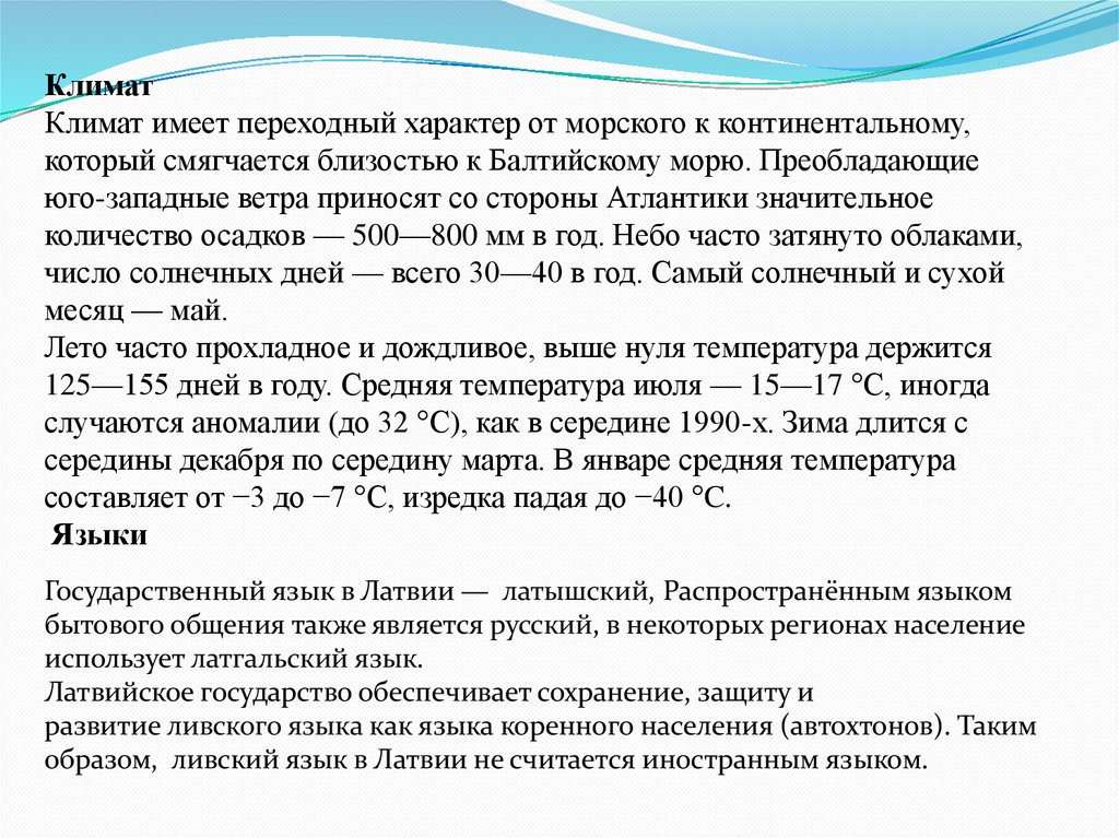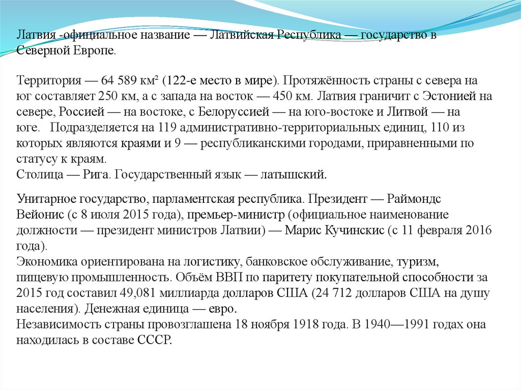 Латвия -официальное название — Латвийская Республика — государство вСеверной Европе.