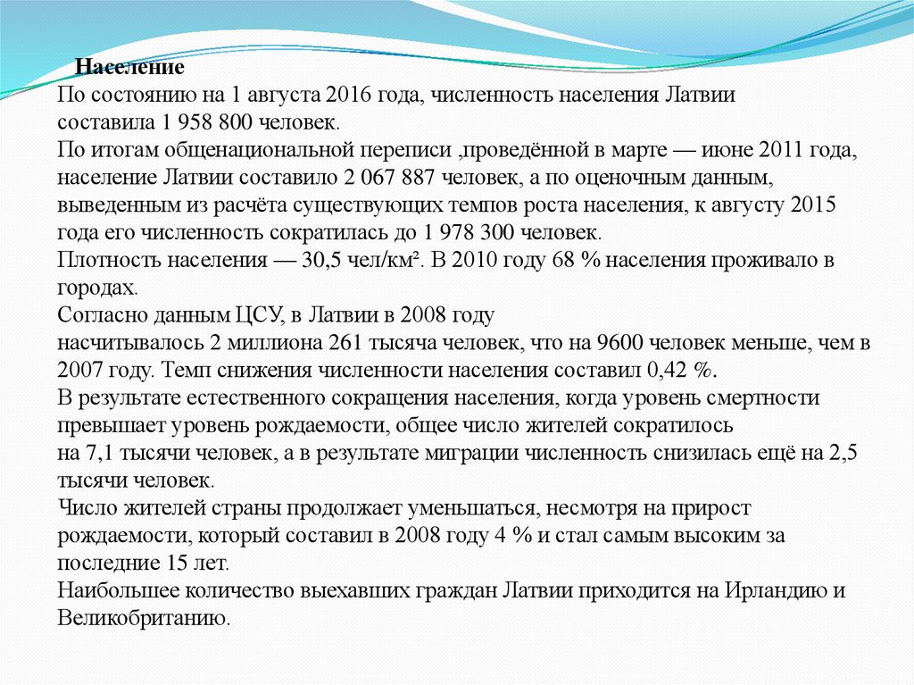 НаселениеПо состоянию на 1 августа 2016 года, численность населения Латвии