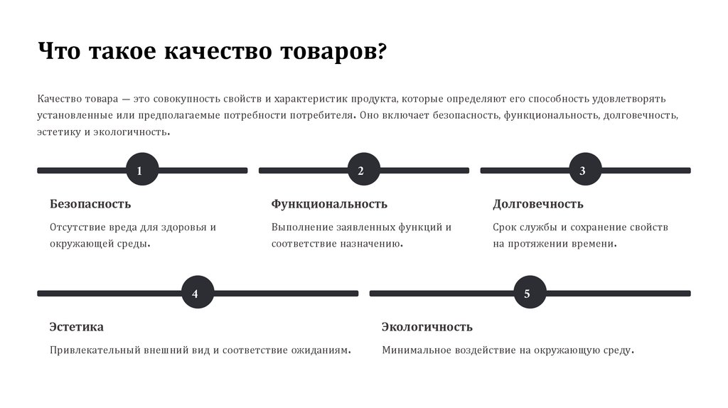 Что такое качество товаров?Качество товара — это совокупность свойств и характеристик продукта, которые определяют его способность удовлетворять