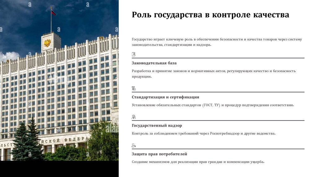 Роль государства в контроле качестваГосударство играет ключевую роль в обеспечении безопасности и качества товаров через систему