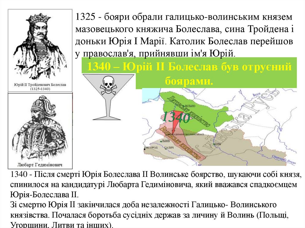 1325 - бояри обрали галицько-волинським княземмазовецького княжича Болеслава, сина Тройдена і